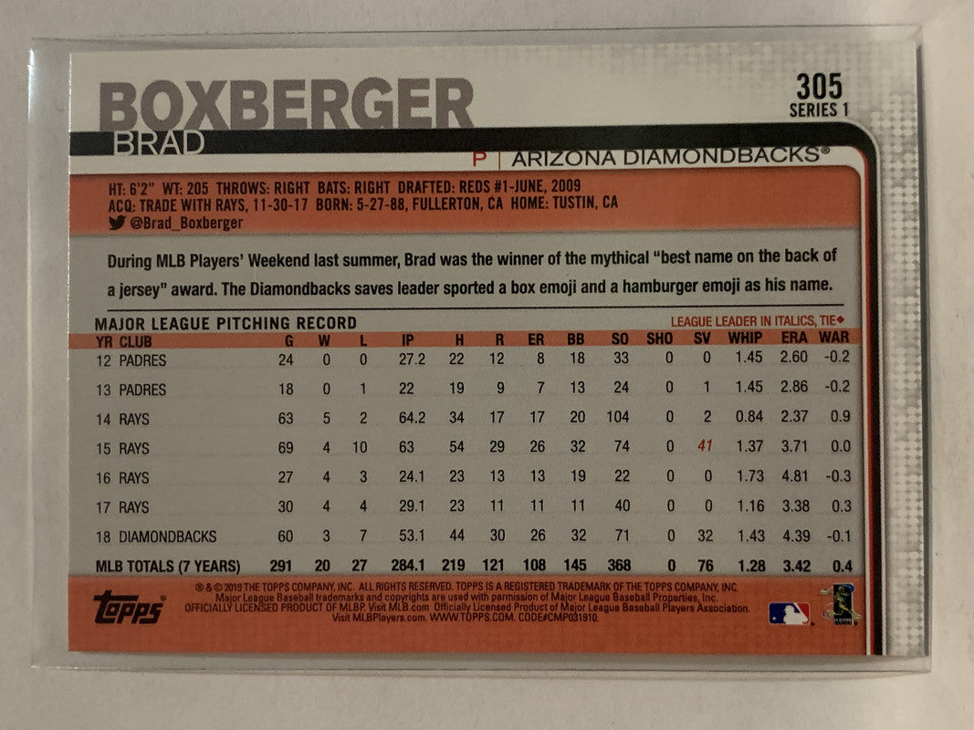 #305 Brad Boxberger Arizona Diamondbacks 2019 Topps Series One Baseball Card