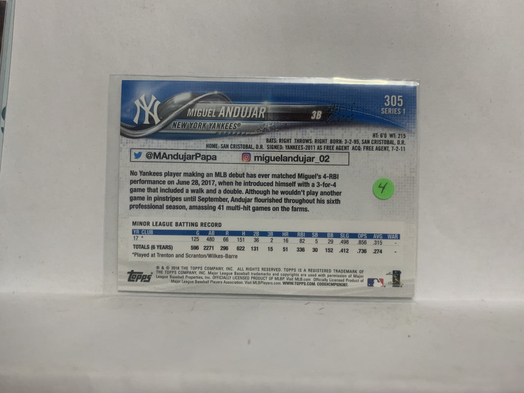 #305 Miguel Andujar Rookie New York Yankees 2018 Topps Series 1 Baseball Card NU