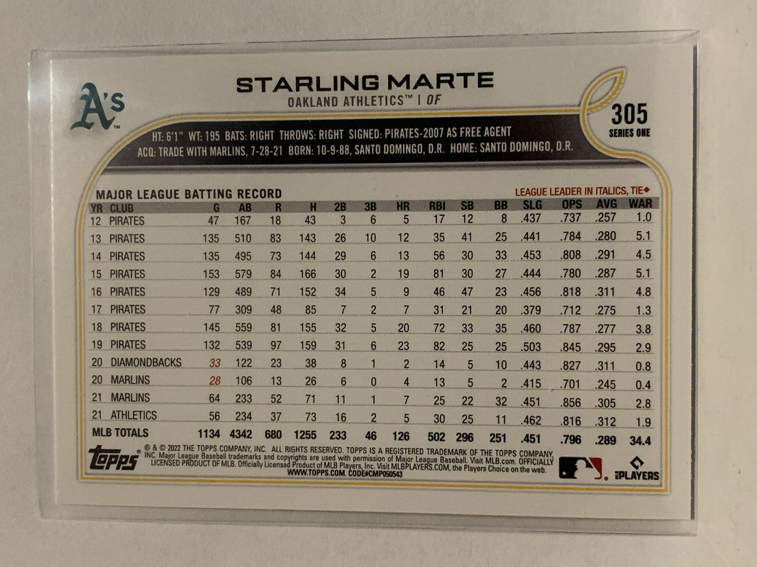 #305 Starling Marte Oakland Athletics 2022 Topps Series 1 Baseball Card MLB