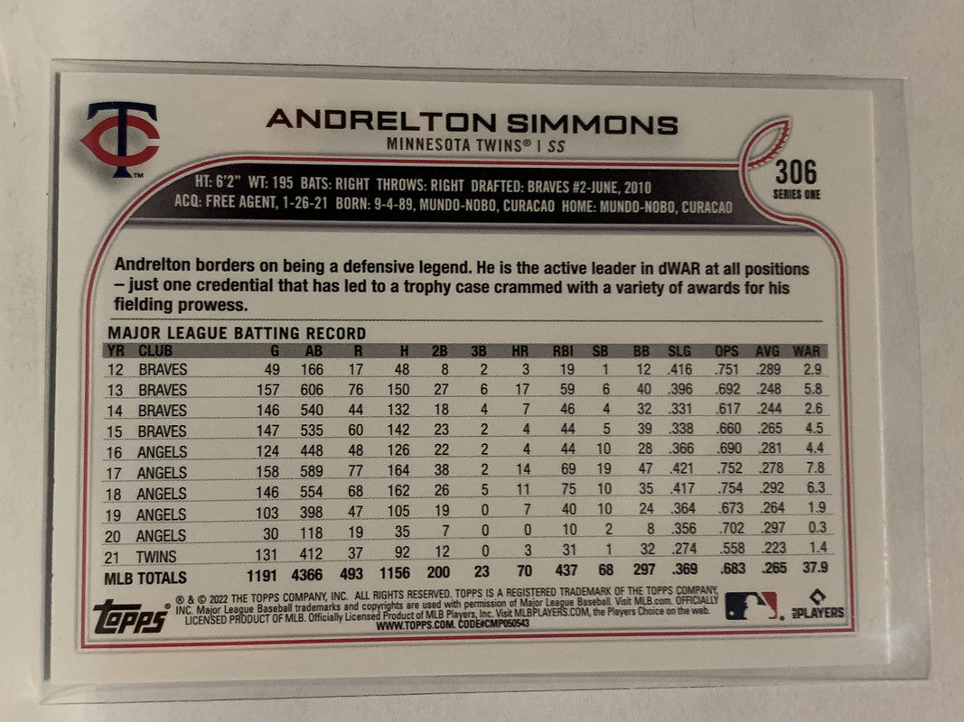 #306 Andrelton Simmons Minnesota Twins 2022 Topps Series One Baseball Card MLB