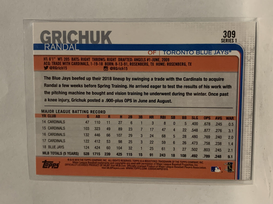 #309 Randal Grichuk Toronto Blue Jays 2019 Topps Series One Baseball Card