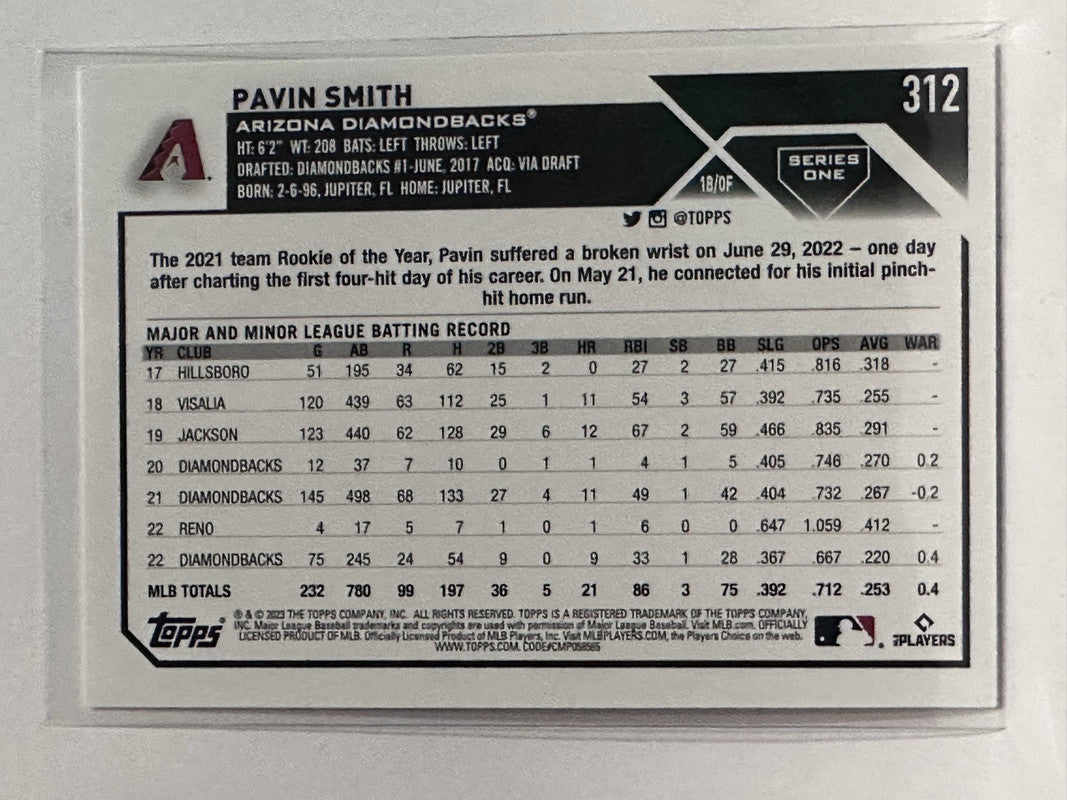 #312 Pavin Smith Arizona Diamondbacks 2023 Topps Series One Baseball Card
