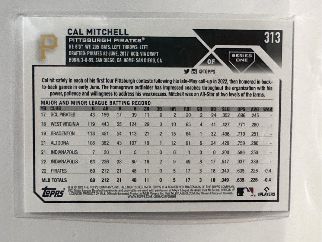 #313 Cal Mitchell Rookie Pittsburgh Pirates 2023 Topps Series One Baseball Card