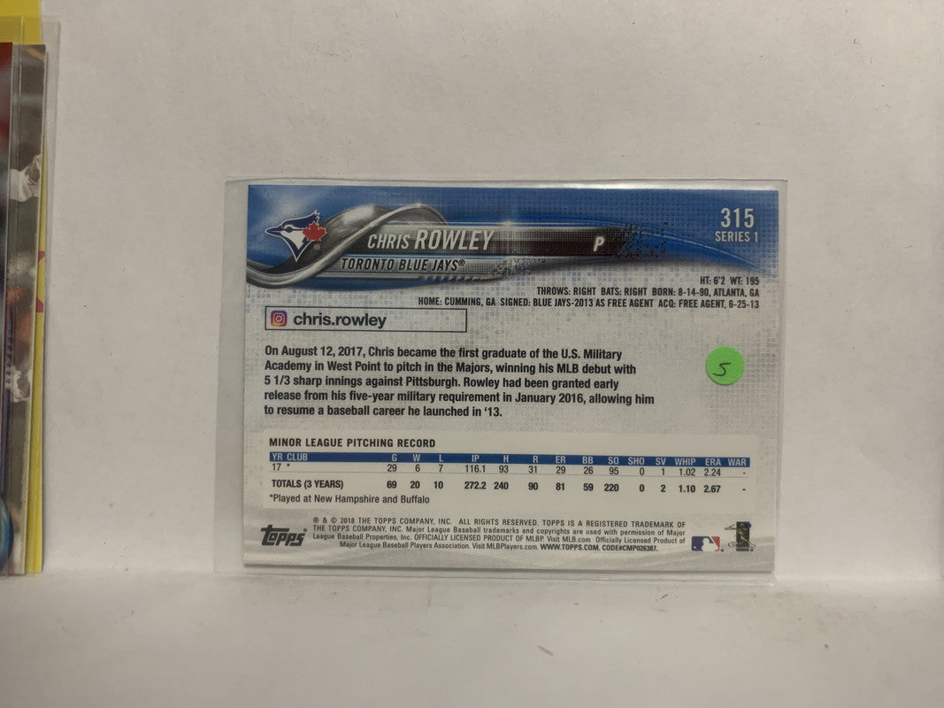 #315 Chris Rowley Rookie Toronto Blue Jays 2018 Topps Series 1 Baseball Card NV