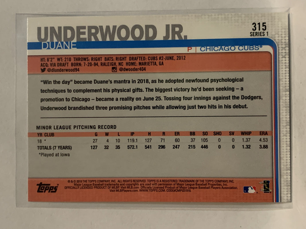 #315 Duane Underwood Jr Chicago Cubs 2019 Topps Series One Baseball Card