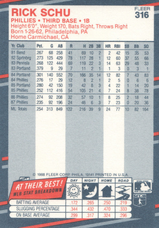 #316 Rick Schu Philadelphia Phillies 1988 Fleer Baseball Card OE