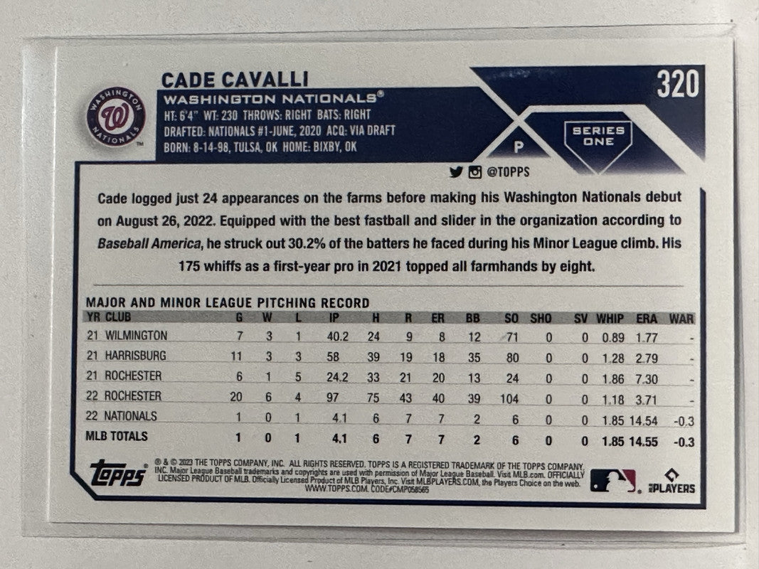 #320 Cade Cavalli Rookie Washington Nationals 2023 Topps Series One Baseball Card