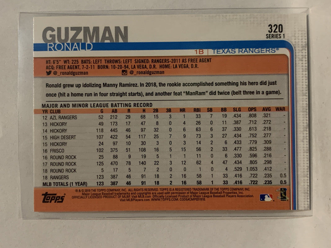 #320 Ronald Guzman Future Stars Texas Rangers 2019 Topps Series One Baseball Card