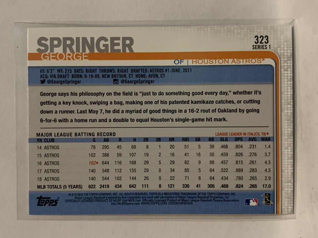 #323 George Springer Houston Astros 2019 Topps Series One Baseball Card