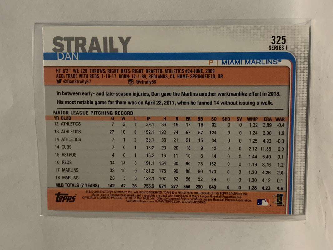 #325 Dan Straily Miami Marlins 2019 Topps Series One Baseball Card