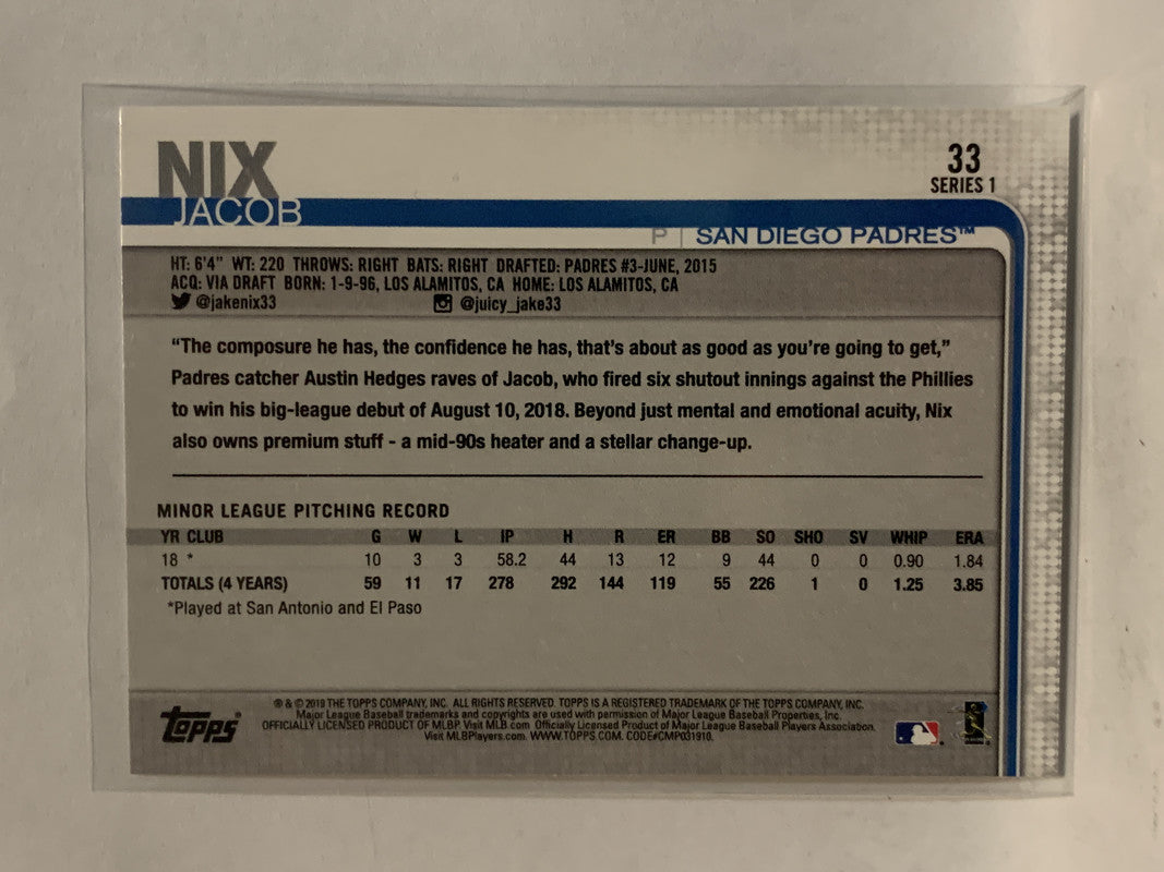 #33 Jacob Nix Rookie San Diego Padres 2019 Topps Series One Baseball Card