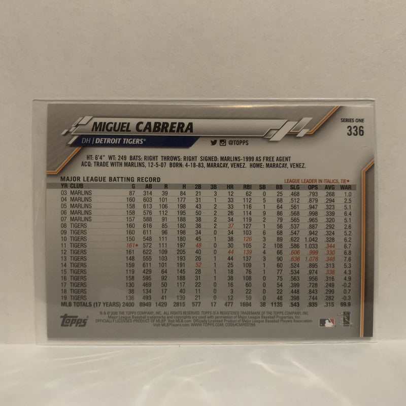 #336 Miguel Cabrera Detroit Tigers 2020 Topps Series One Baseball Card JB