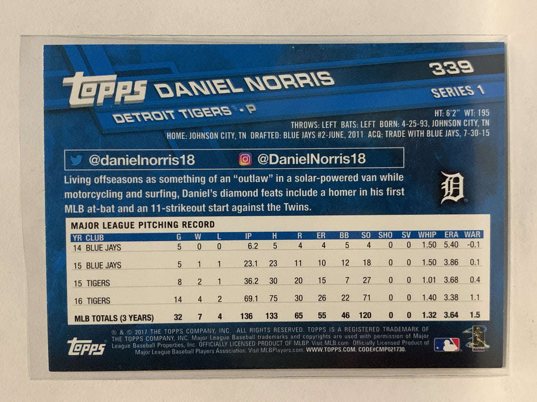 #339 Daniel Norris Detroit Tigers 2017 Topps Series One Baseball Card