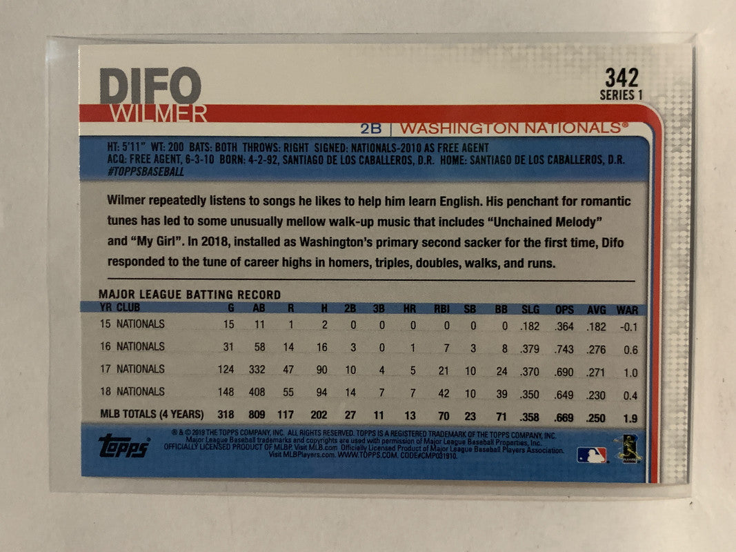 #342 Wilmer Difo Washington Nationals 2019 Topps Series One Baseball Card