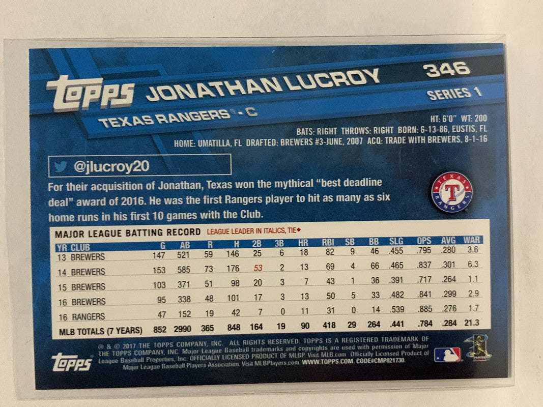 #346 Jonathan Lucroy Texas Rangers 2017 Topps Series One Baseball Card