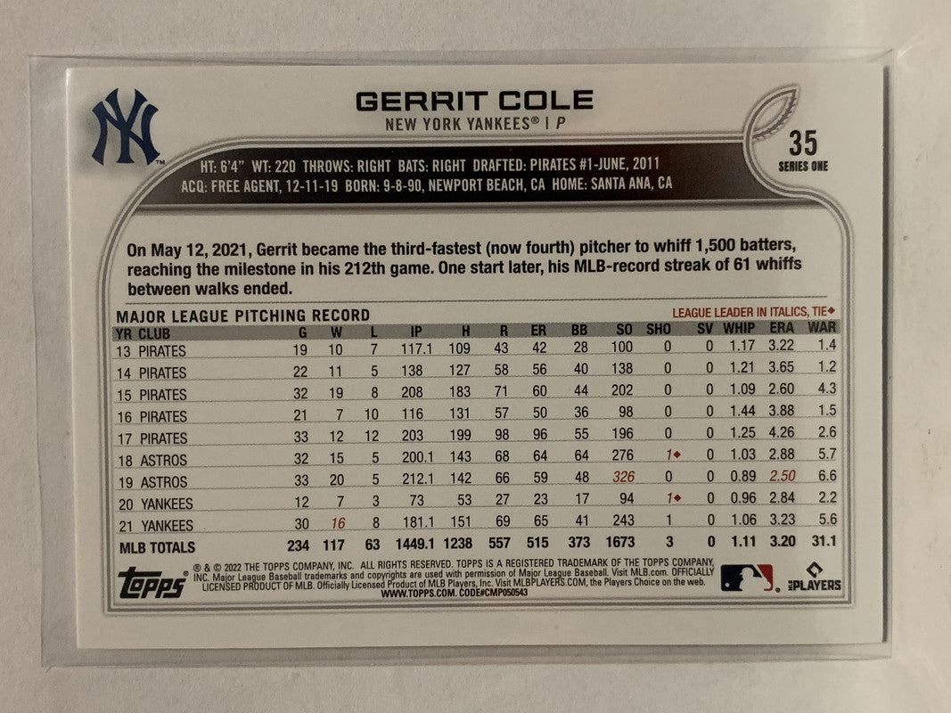 #35 Gerrit Cole New York Yankees 2022 Topps Series One Baseball Card MLB