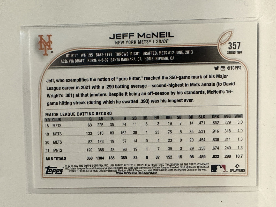 #357 Jeff McNeil New York Mets 2022 Topps Series Two Baseball Card