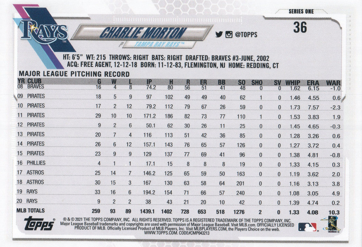 #36 Charlie Morton Tampa Bay Rays 2021 Topps Series 1 Baseball Card