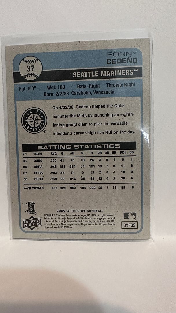 #37 Ronny Cedeno Seattle Mariners 2009 O-Pee-Chee Baseball Card