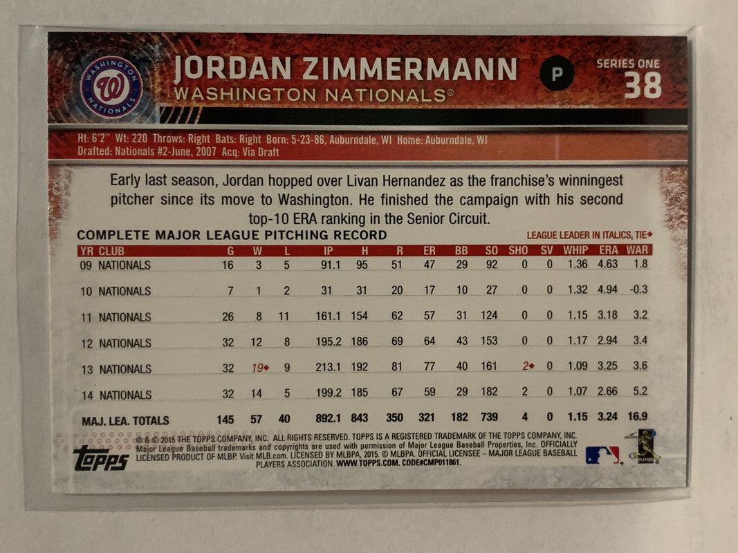 #38 Jordan Zimmermann Washington Nationals 2015 Topps Series One Baseball Card