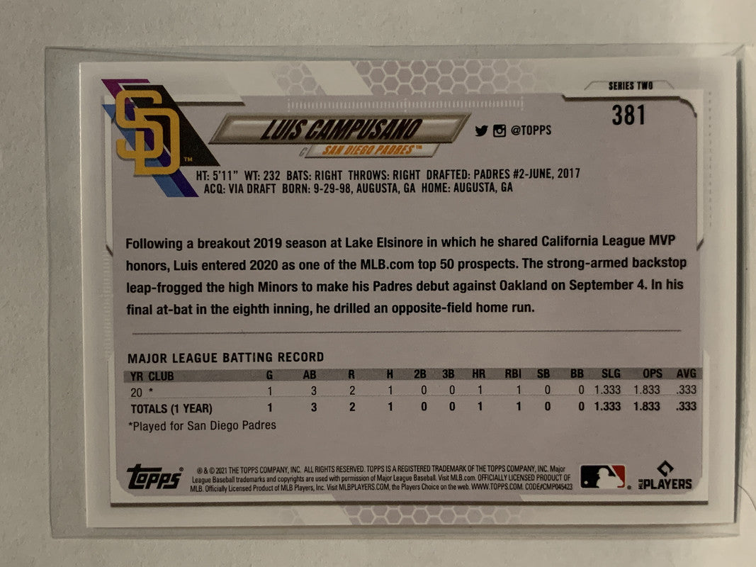 #381 Luis Campusano Rookie San Diego Padres 2021 Topps Series 2 Baseball Card