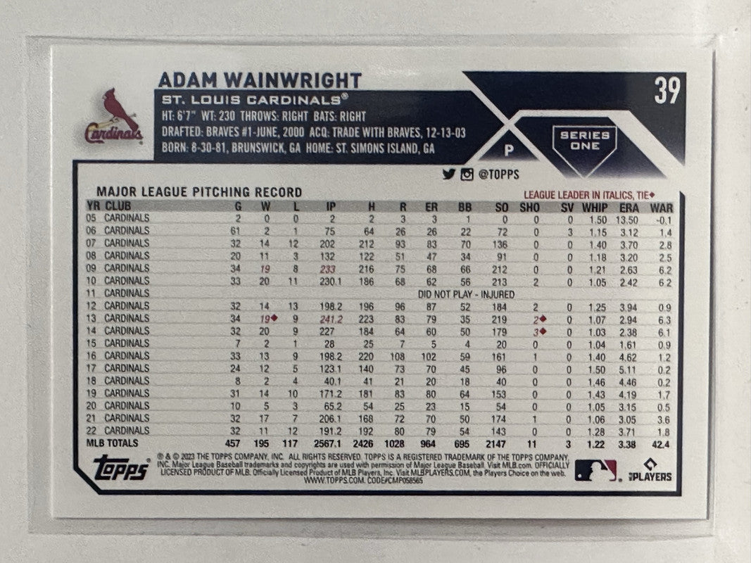 #39 Adam Wainwright St Luois Cardinals 2023 Topps Series One Baseball Card