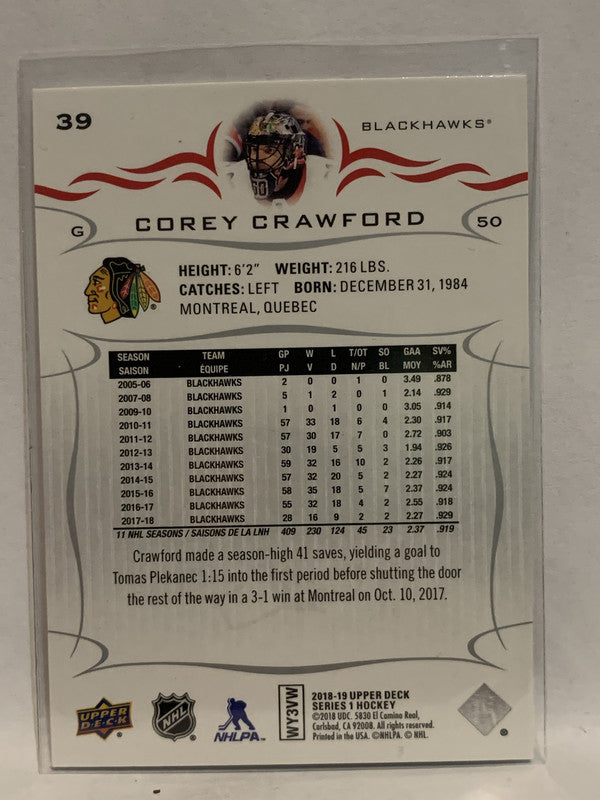 #39 Corey Crawford Chicago Blackhawks 2018-19 Upper Deck Series One Baseball Card