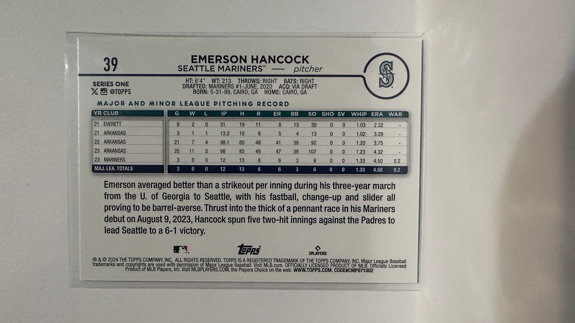#39 Emerson Hancock Rookie Seattle Mariners 2024 Topps Baseball Card