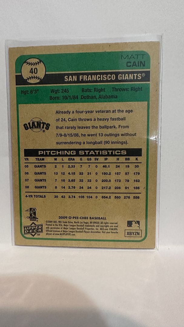#40 Matt Cain San Francisco Giants 2009 O-Pee-Chee Baseball Card