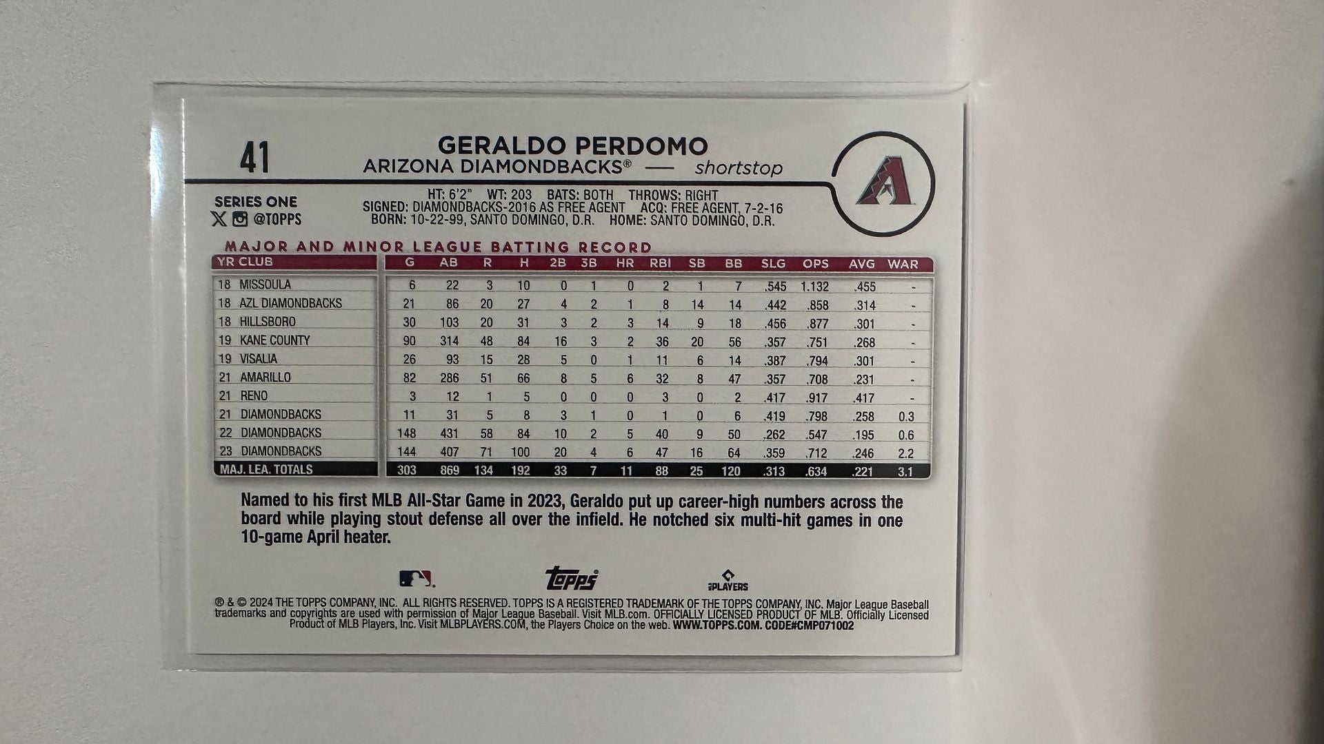 #41 Geraldo Perdomo Arizona Diamondbacks 2024 Topps Baseball Card