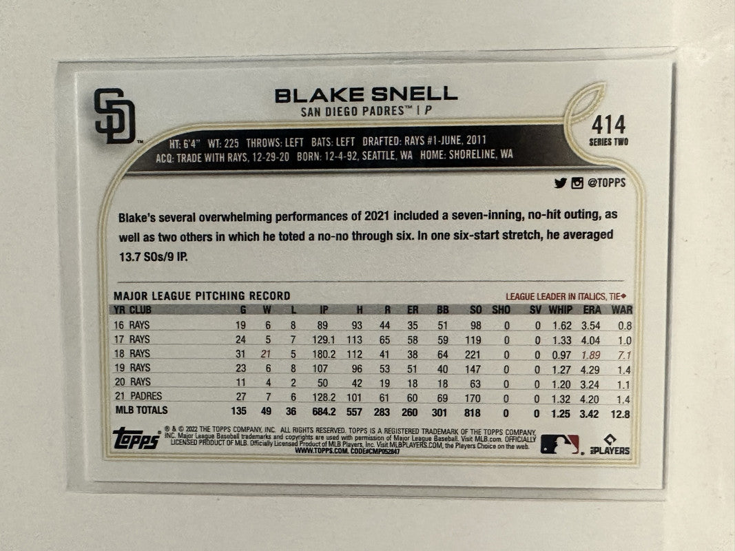#414 Blake Snell San Diego Padres 2022 Topps Series Two Baseball Card