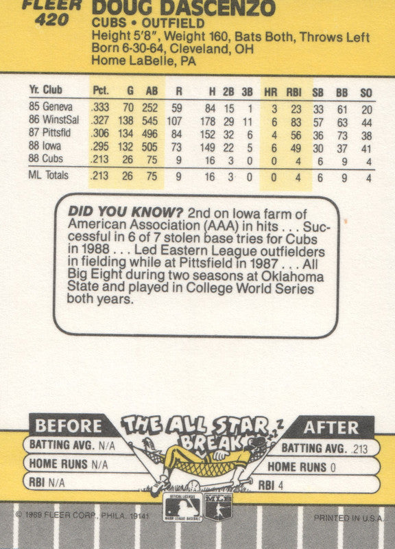 #420 Doug Dascenzo Chicago Cubs 1989 Fleer Baseball Card OF