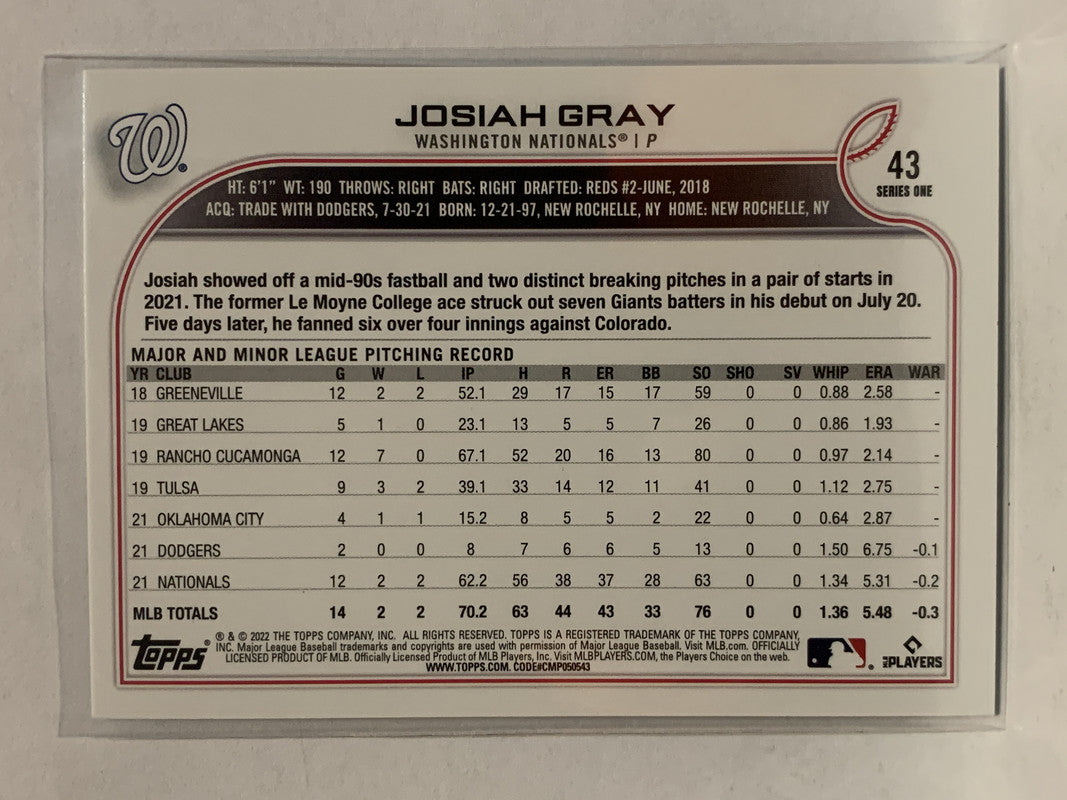 #43 Josiah Gray Rookie Royal Blue Washington Nationals 2022 Topps Series One Baseball Card MLB