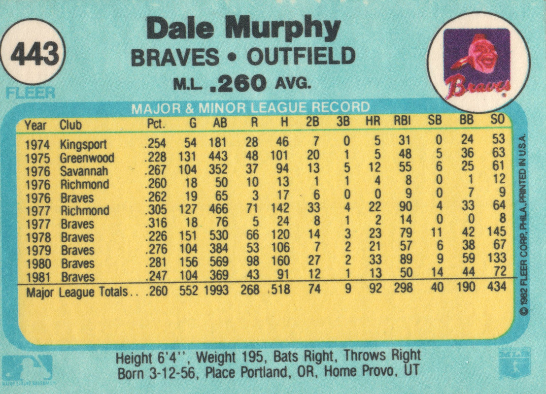 #443 Dale Murphy Atlanta Braves 1982 Fleer Baseball Card OD