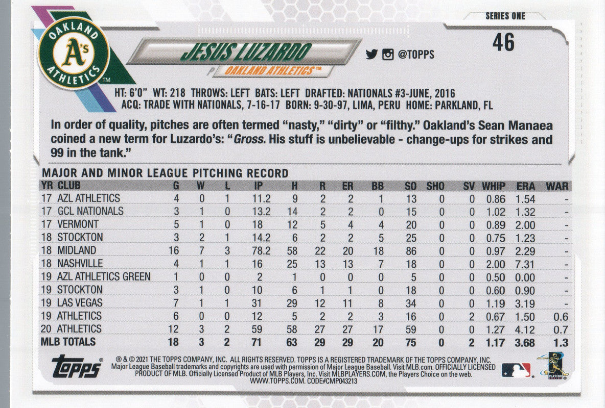 #46 Jesus Luzardo Future Stars Oakland Athletics 2021 Topps Series 1 Baseball Card
