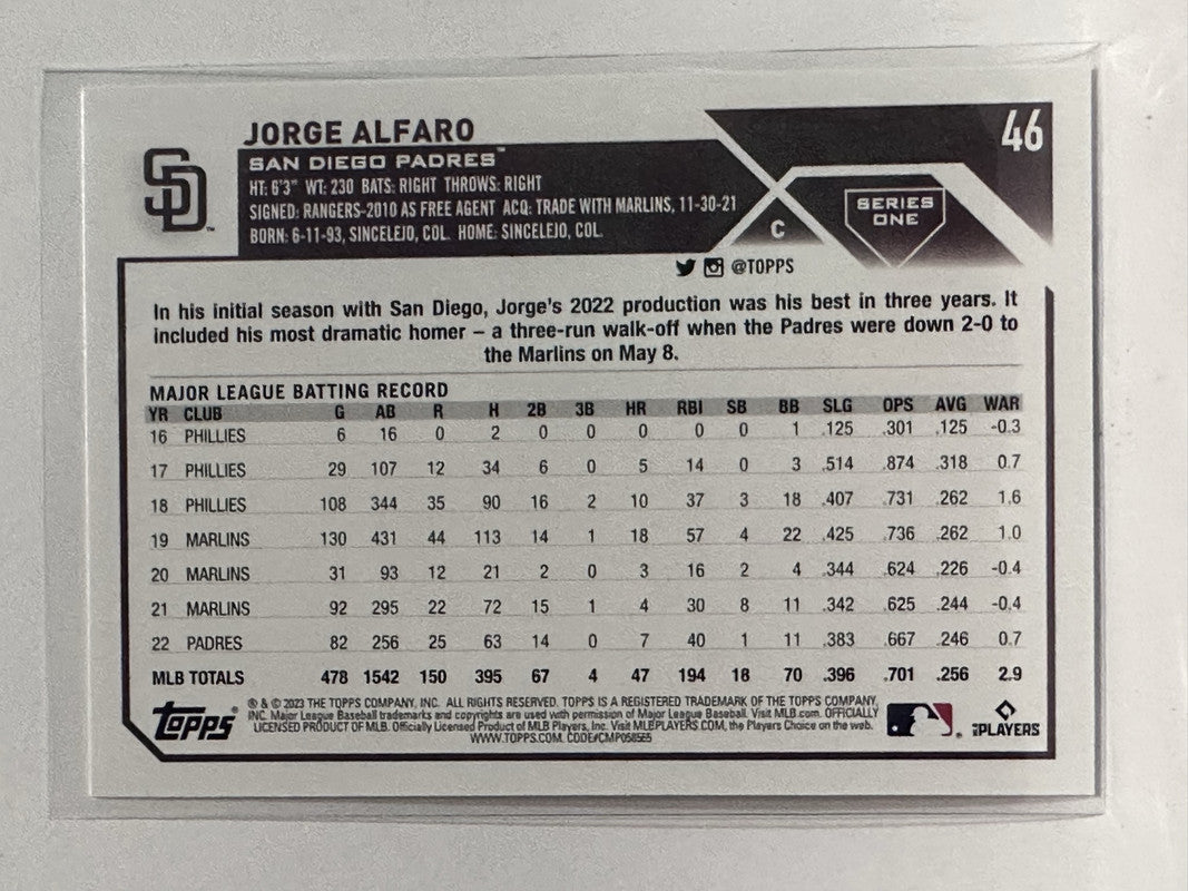 #46 Jorge Alfaro San Diego Padres 2023 Topps Series One Baseball Card
