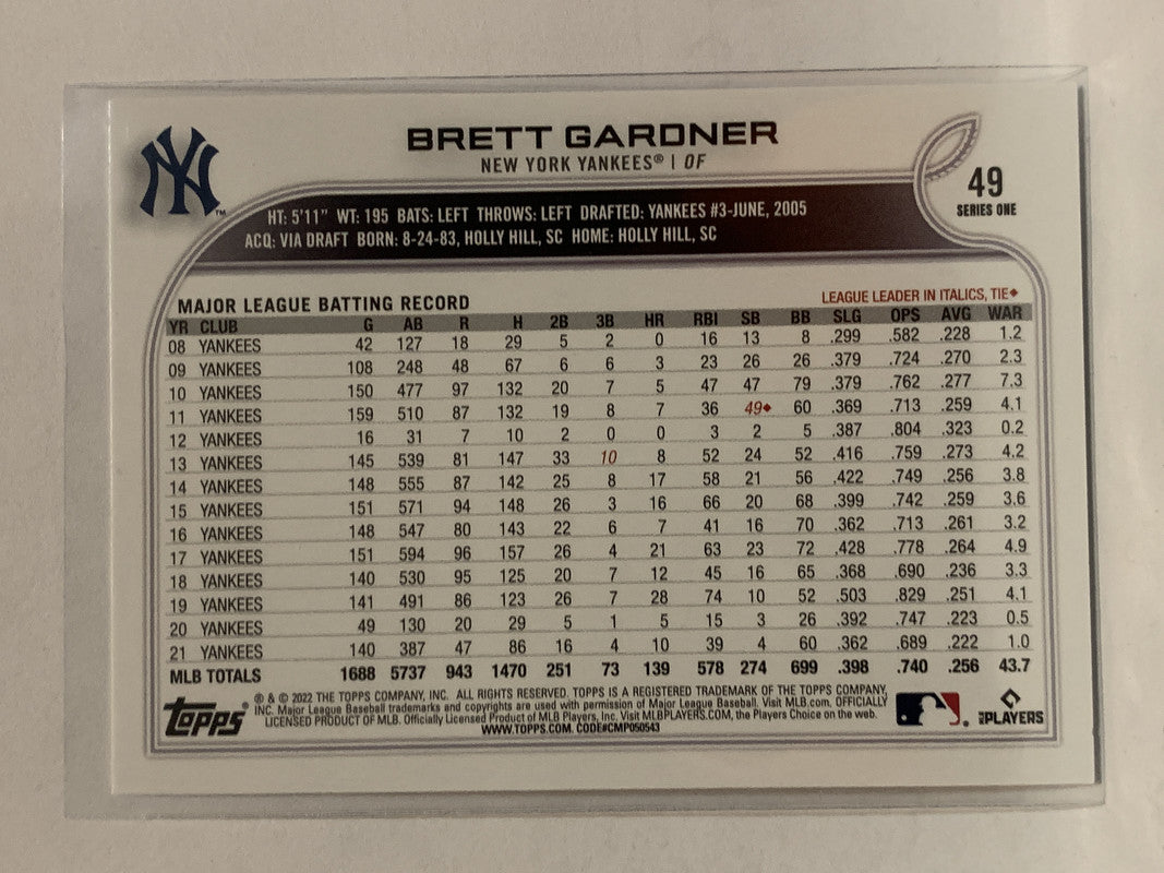 #49 Brett Gardner New York Yankees 2022 Topps Series One Baseball Card MLB