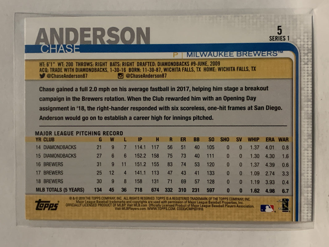 #5 Chase Anderson Milwaukee Brewers 2019 Topps Series One Baseball Card