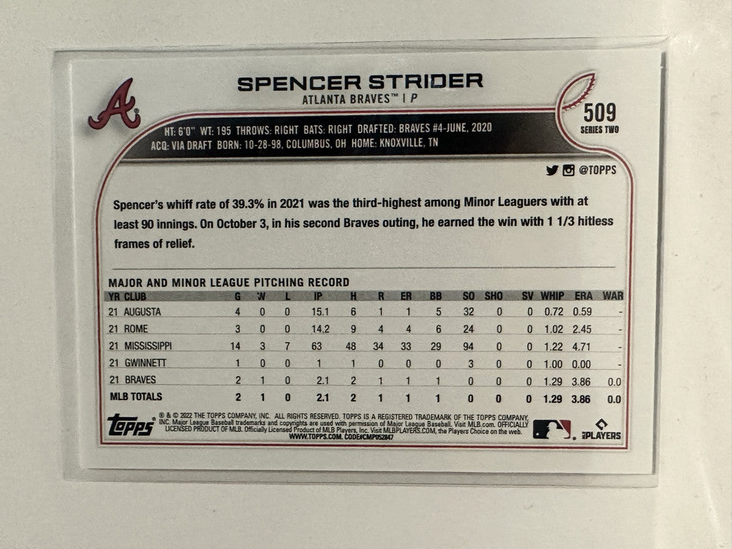 #509 Spencer Strider Rookie Atlanta Braves 2022 Topps Series Two Baseball Card