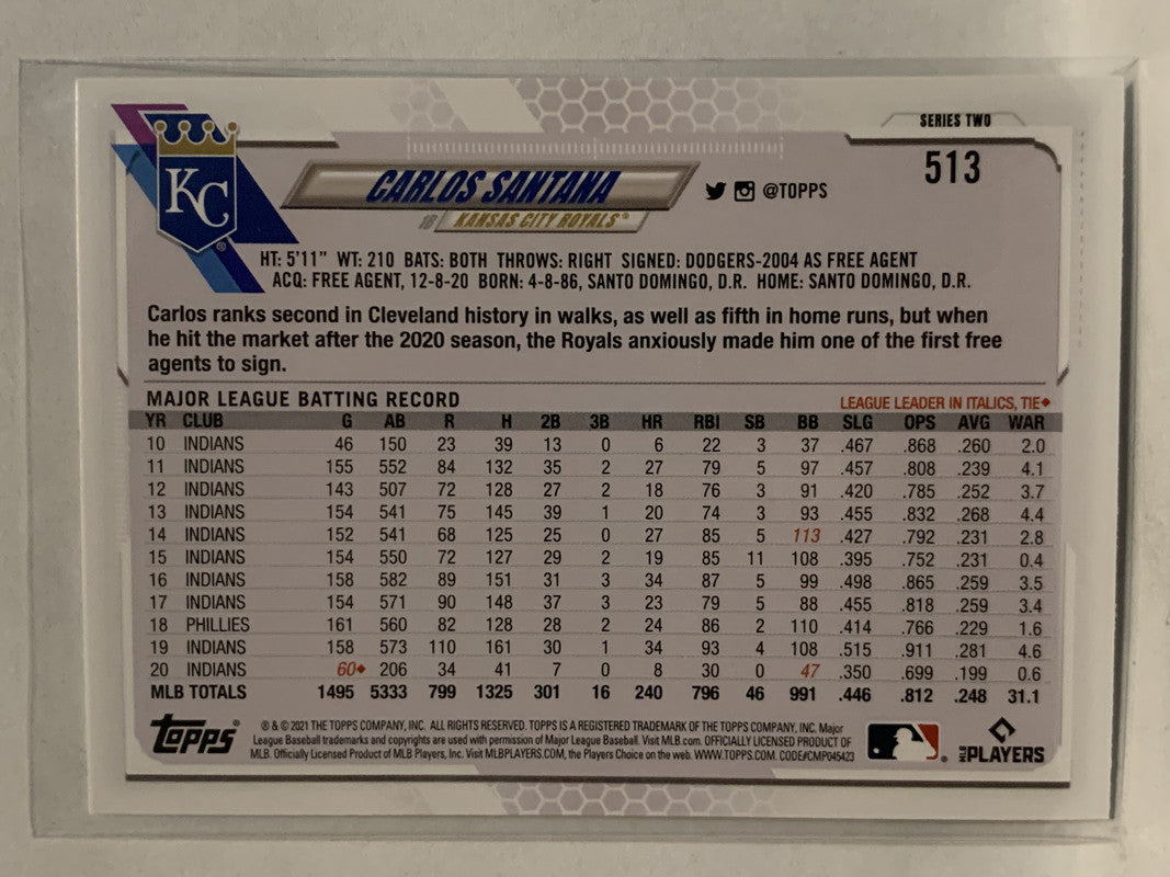 #513 Carlos Santana Kansas City Royals 2021 Topps Series 2 Baseball Card