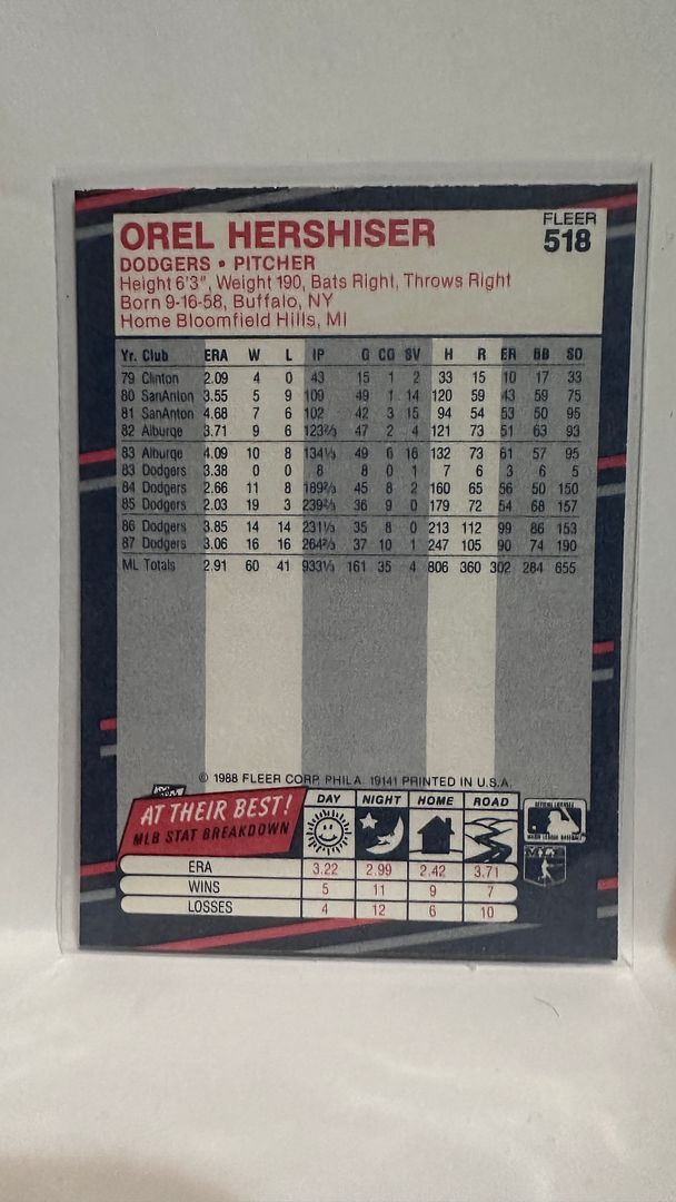 #518 Orel Hershiser Los Angeles Dodgers 1988 Fleer Baseball Card
