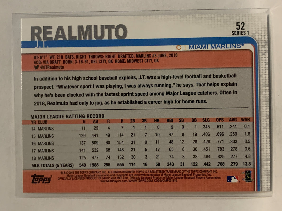 #52 J.T. Realmuto Miami Marlins 2019 Topps Series One Baseball Card