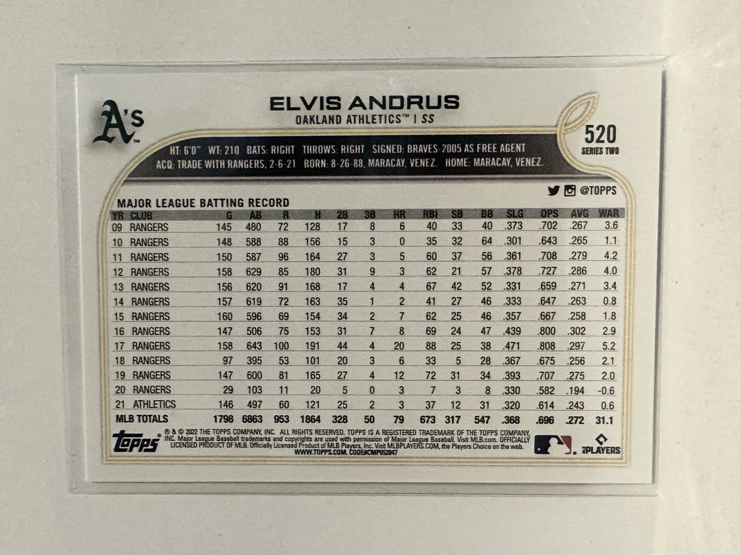 #520 Elvis Andrus Oakland Athletics 2022 Topps Series Two Baseball Card