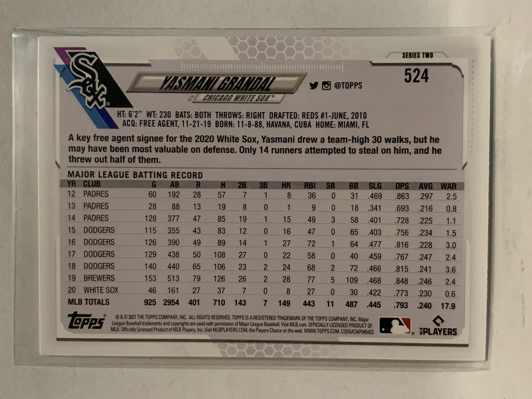 #524 Yasmani Grandal Chicago White Sox 2021 Topps Series 2 Baseball Card