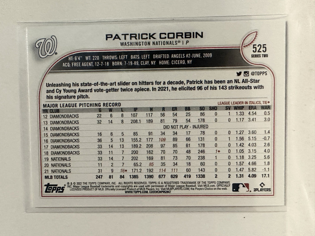 #525 Patrick Corbin Washington Nationals 2022 Topps Series Two Baseball Card