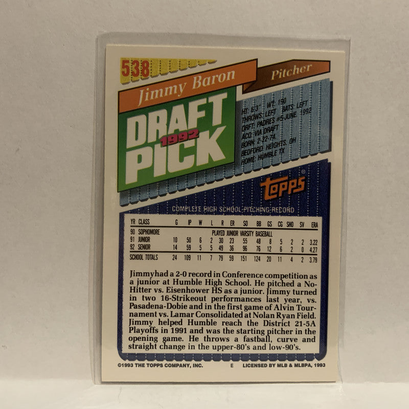 #538 Jimmy Baron 1992 Draft Pick San Diego Padres 1993 Topps Baseball Card IS