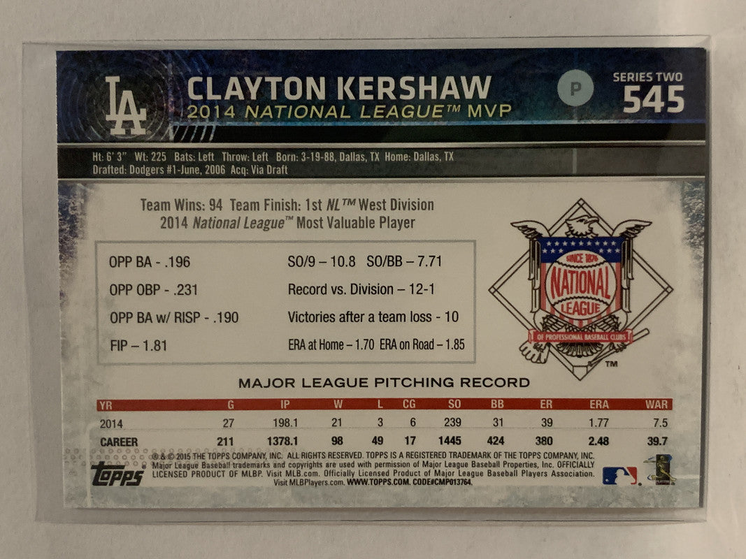#545 Clayton Kershaw 2014 National League MVP 2015 Topps Series two Baseball Card
