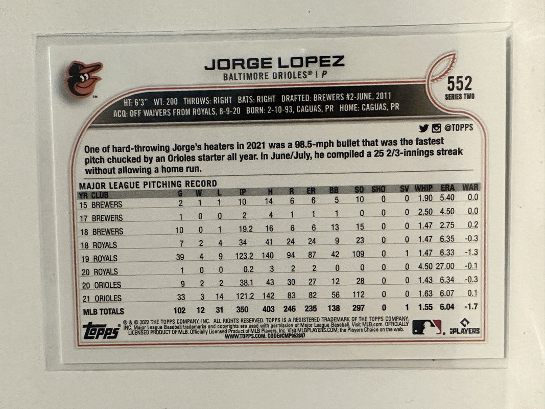 #552 Jorge Lopez Baltimore Orioles 2022 Topps Series Two Baseball Card