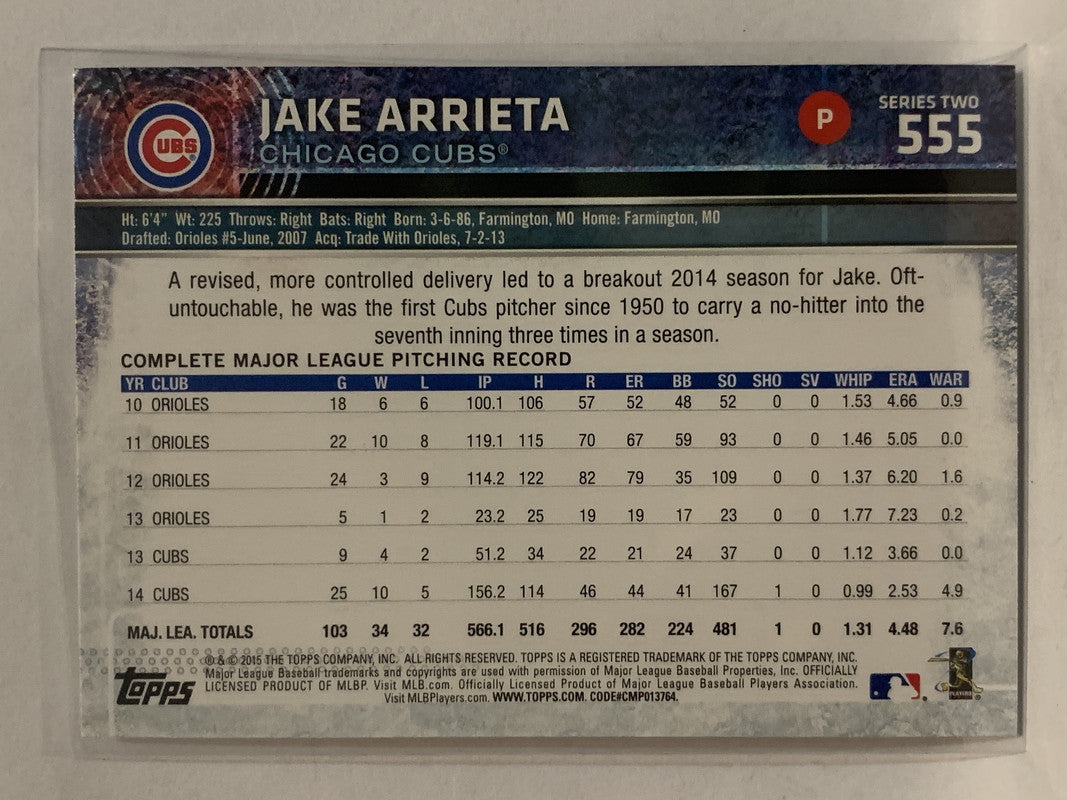 #555 Jake Arrieta Chicago Cubs 2015 Topps Series two Baseball Card