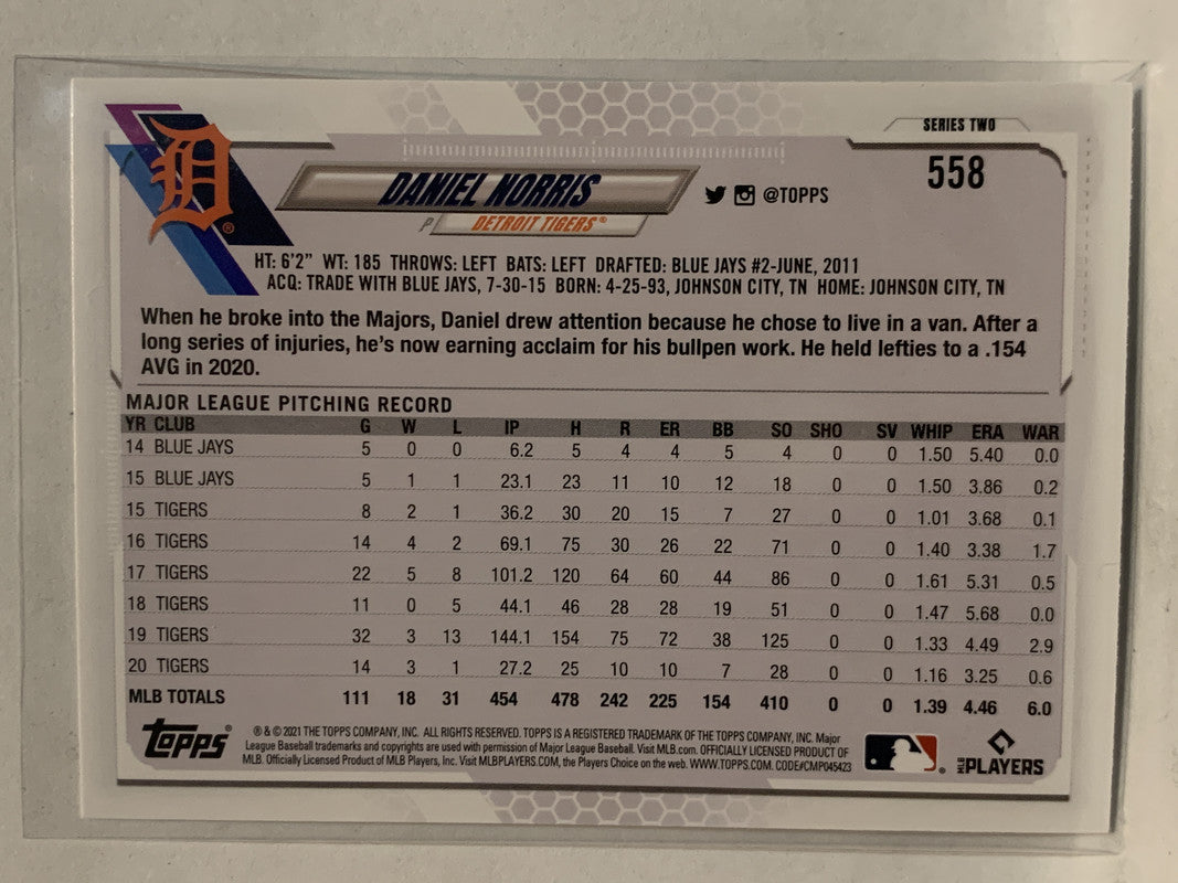 #558 Daniel Norris Detroit Tigers 2021 Topps Series 2 Baseball Card
